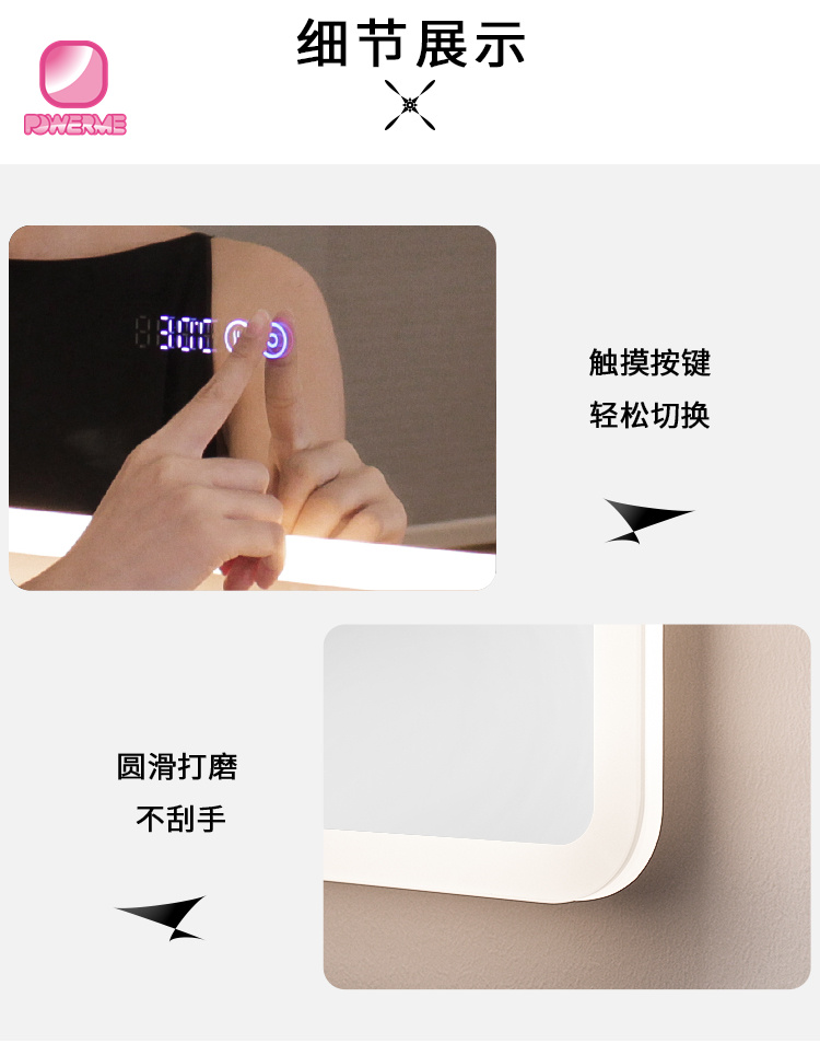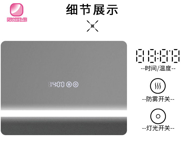 4.鏡面雙鍵觸摸帶時鐘開關,無極調節燈光亮度