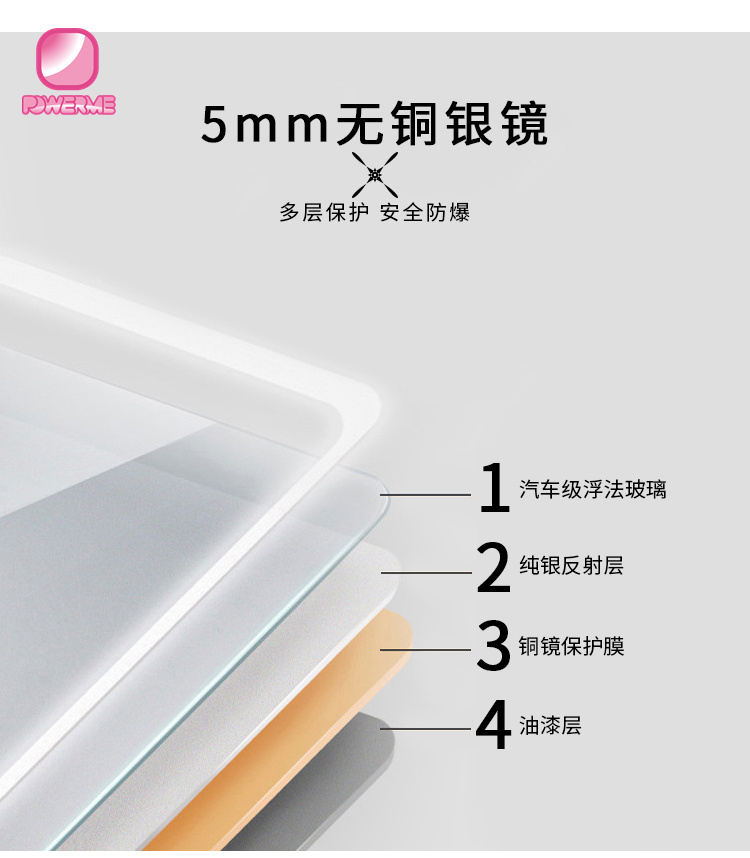 2.環保無銅鏡面,浮化玻璃,帶有拋光邊緣保護手指,5毫米厚度,適用于高濕度位置使用